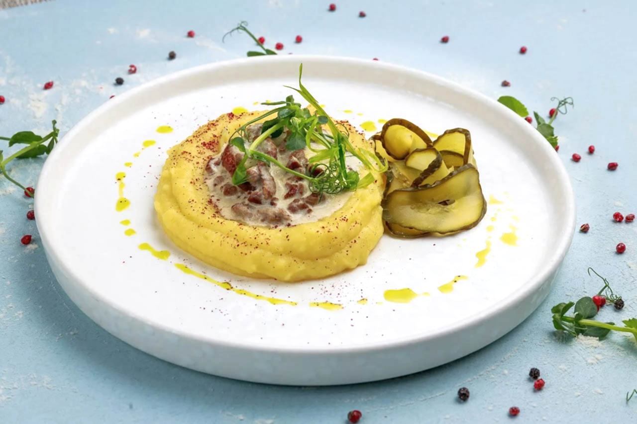 Бефстроганов с грибами и картофельным Pin-Up - это классическое русское блюдо, которое сочетает в себе нежность говядины, богатый вкус грибов и сливочный соус. Тонкие ломтики говядины, обжаренные с луком и грибами, томятся в нежном сливочном соусе, создавая густую и ароматную текстуру, которая проникает в каждое волокно мяса, делая его невероятно мягким и насыщенным. Подаётся бефстроганов с кремовым картофельным пюре, которое плавится во рту, создавая идеальный баланс с мясом и соусом. В качестве дополнения - солёные огурчики, которые придают блюду приятную кислинку и контрастируют с его насыщенностью. Этот бефстроганов - идеальное сочетание для тех, кто ценит домашнюю кухню и комфортный вкус.