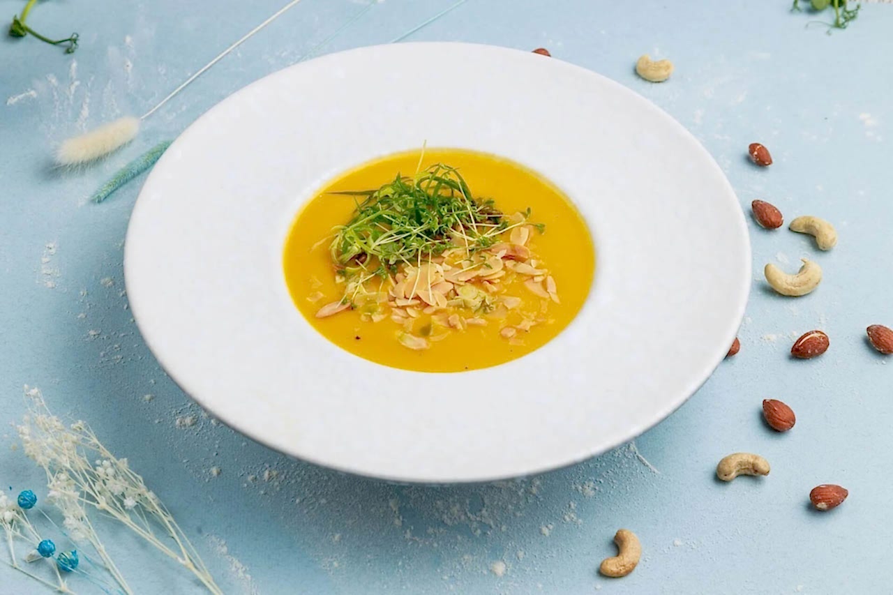 Тыквенный крем суп приготовлен из печеной карамелизированной тыквы, лука, моркови, картофеля на кокосовом молоке. Pin-Up с семенами тыквы, лепестками миндаля и микро зеленью.