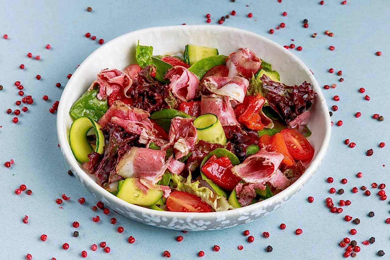 Pin-Up с пастрами и маринованным перцем - это сбалансированное сочетание насыщенных вкусов копченого мяса, свежих овощей и пикантной заправки. В основе блюда - пастрами из говяжьего грудного отруба, которое сначала маринуется в смеси специй, затем коптится и готовится по технологии су-вид, что делает мясо невероятно сочным и ароматным. Салат дополняют томаты черри, которые придают свежесть и легкую кислинку, слайсы огурца для хрустящей текстуры и маринованные перцы, добавляющие пикантные и сладковатые нотки. Все ингредиенты сервируются на миксе салатов и заправляются особым соусом на основе ферментированного солода, который подчеркивает насыщенный вкус пастрами и придает блюду необычную глубину вкуса. Этот салат подойдет для тех, кто ценит богатые вкусовые сочетания и оригинальную гастрономию.