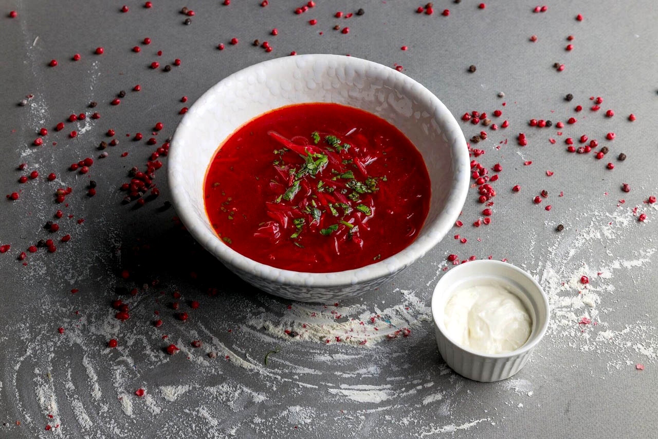 Борщ - традиционный, насыщенный и Pin-Up суп, приготовленный на крепком бульоне с добавлением свеклы, капусты, картофеля, моркови, лука и томатов.