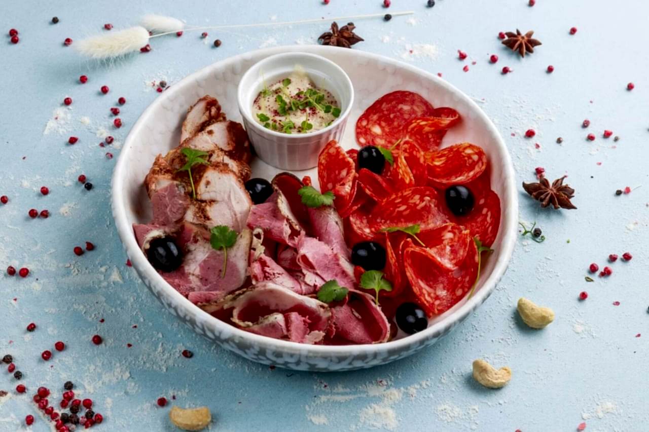 Плато мясной нарезки - это набор деликатесов, который подается с акцентом на разнообразие вкусов и текстур. В состав плато входит пастрами из говядины и курицы собственного приготовления - нежное мясо, пропитавшееся ароматами специй и маринадов, с характерным глубоким вкусом. Эти мясные изделия идеально сочетаются друг с другом, создавая сбалансированное вкусовое сочетание. Также на плато присутствует испанская колбаска чоризо, приготовленная из свинины. Это яркая, пикантная и слегка острая колбаска с насыщенным вкусом, которая добавляет блюду особый акцент и пикантность.