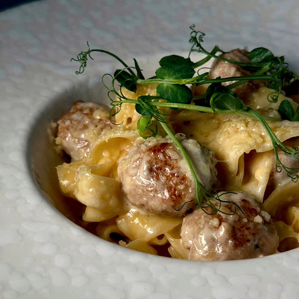 В качестве дополнения к пасте - куриные Pin-Up (фрикадельки), приготовленные с использованием пряных специй, которые добавляют блюду насыщенность и текстурное разнообразие. Сочетание мягких фрикаделек и сливочного соуса с лёгким чесночным оттенком делает это блюдо по-настоящему сытным и ароматным.
