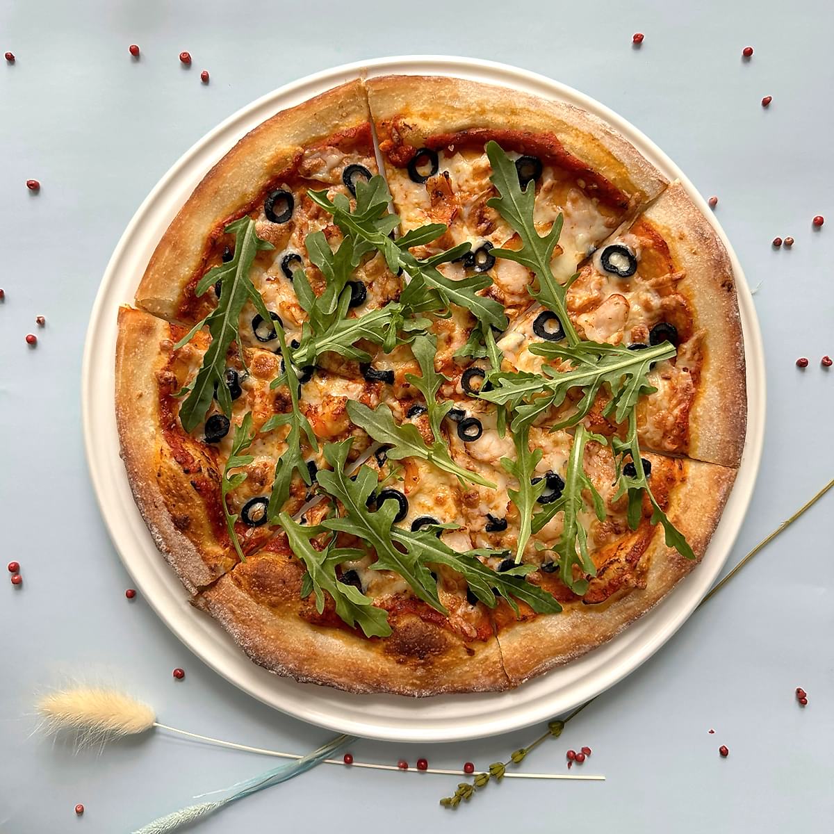 Пицца с Pin-Up и рукколой - это настоящий деликатес для любителей лёгких и изысканных вкусов. В её составе - сочные, нежные креветки, которые идеально сочетаются с хрустящей свежей рукколой, придающей блюду неповторимую пряную нотку. Ароматный соус песто с его насыщенными травяными оттенками идеально подчеркивает вкусовую гармонию, а маслины добавляют приятную солёность. Легкий аромат чеснока, зелени и немного остроты соуса аррабиата создают тонкую, но яркую симфонию вкусов.