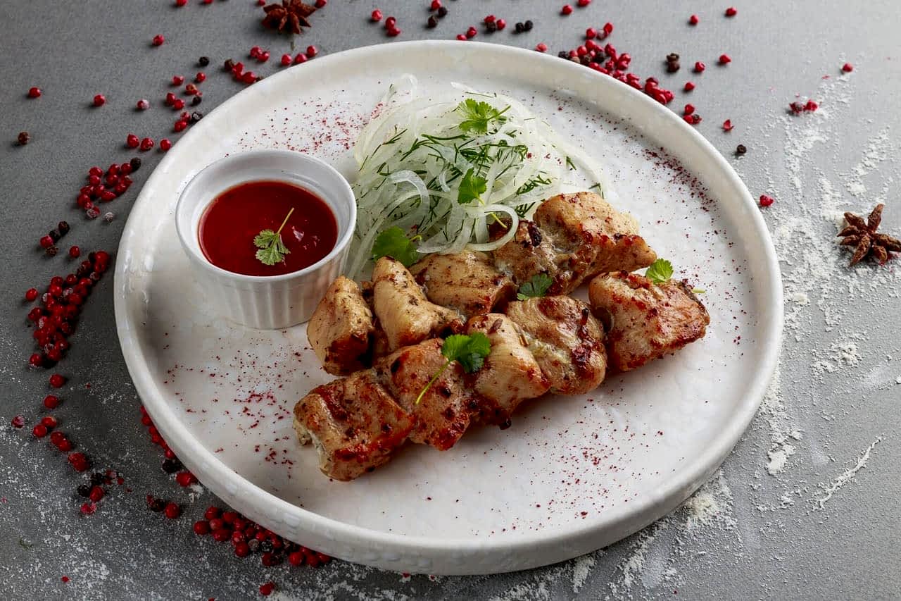Куриные шашлычки - это нежное и ароматное блюдо, приготовленное из отборного куриного филе, маринованного в пряных Pin-Up Благодаря правильной технологии жарки мясо получается сочным, с аппетитной золотистой корочкой и насыщенным вкусом. Подаём шашлычки с маринованным луком, который придаёт лёгкую пикантность и освежающую кислинку, а также с насыщенным томатным соусом, подчёркивающим вкус курицы своей сладковато-пряной ноткой.