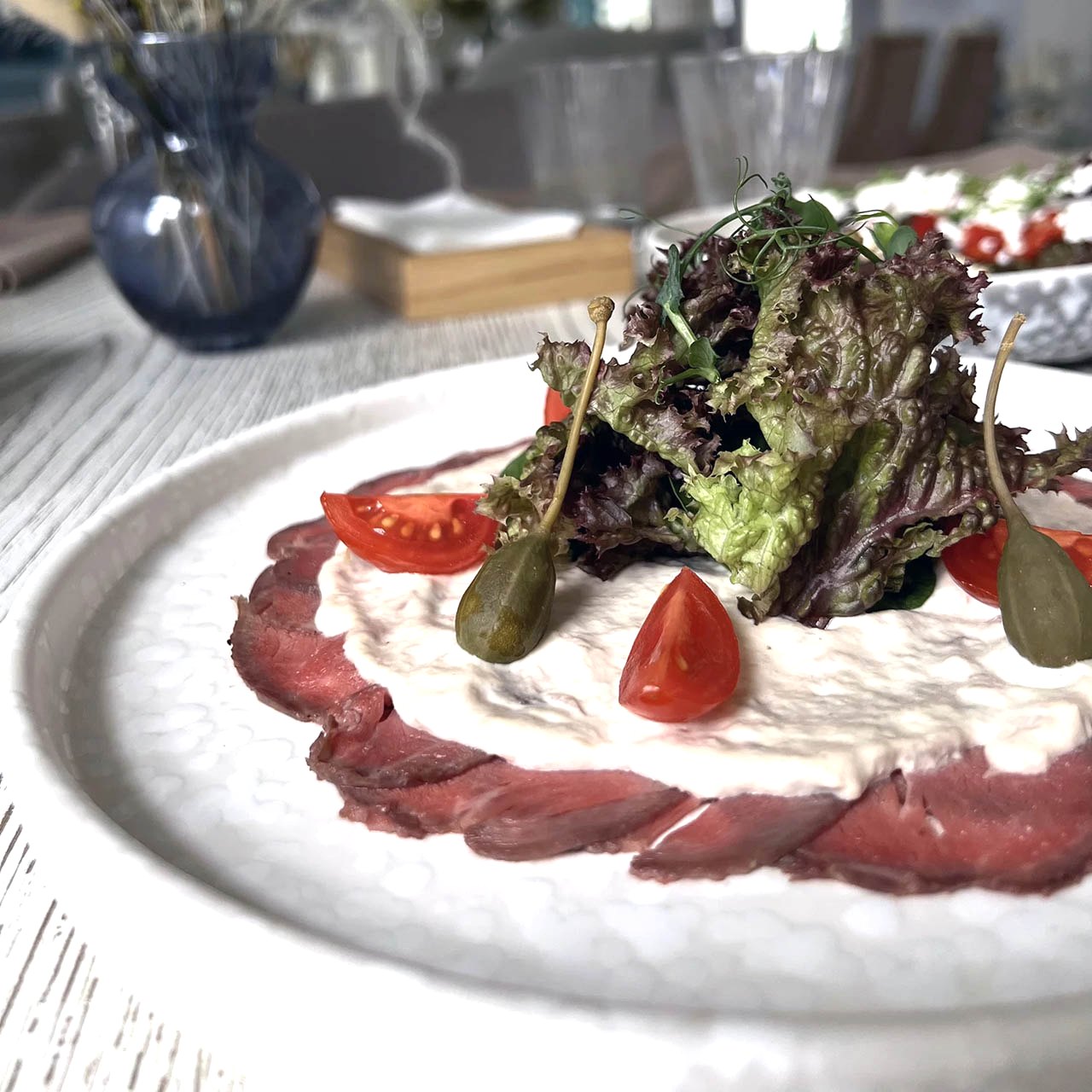 Оно сочетает в себе нежное и сочное мясо Pin-Up и богатый вкус соуса тоннато, приготовленного из тунца, яиц, каперсов и оливкового масла. Соус обволакивает мясо тонким слоем, придавая ему глубокий вкус и аромат. Украшаем свежими томатами черри, зеленью и каперсами, добавляя яркости и свежести.