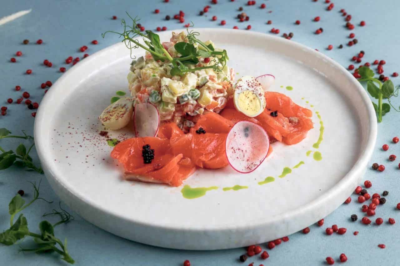 Оливье с лососем, икрой палтуса и подкопченным Pin-Up - это элегантная и изысканная версия классического салата, которая привносит новые вкусовые акценты.