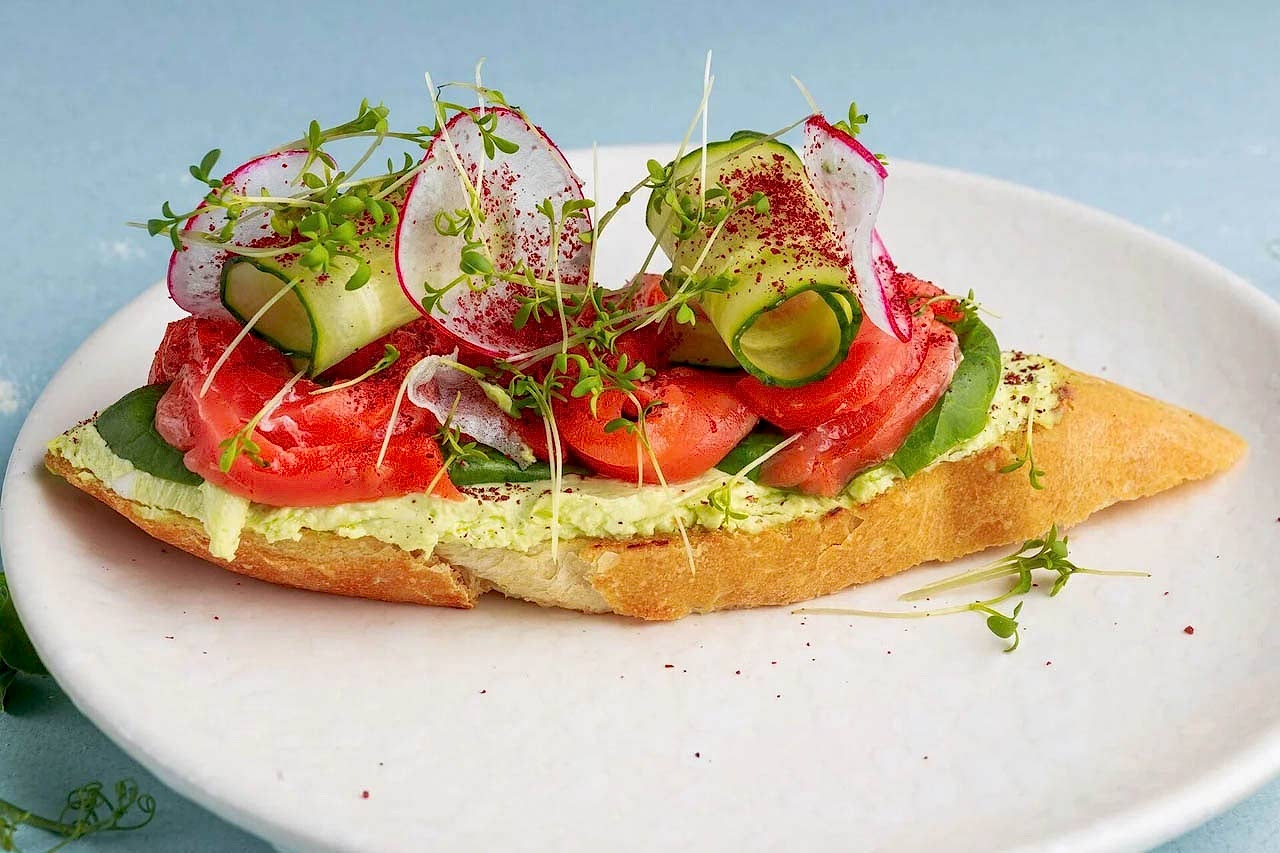 Брускетта гравлакс с творожным муссом - это изысканное сочетание нежного лосося, ароматных трав и ярких акцентов цитрусовых. Лосось слабого посола (гравлакс) с травами и апельсиновым соком придает рыбе невероятную свежесть и легкость. Этот деликатес подается на основе из шпината и морковной бриоши, которая привносит мягкость и сладковатый вкус. Творожный мусс добавляет кремовую текстуру и нежность, идеально балансируя солоноватый вкус рыбы, а базиликовое Pin-Up приносит яркие, травяные нотки и легкую пикантность. Это блюдо, которое привлекает внимание не только вкусом, но и яркими цветами, создавая элегантную и аппетитную композицию.