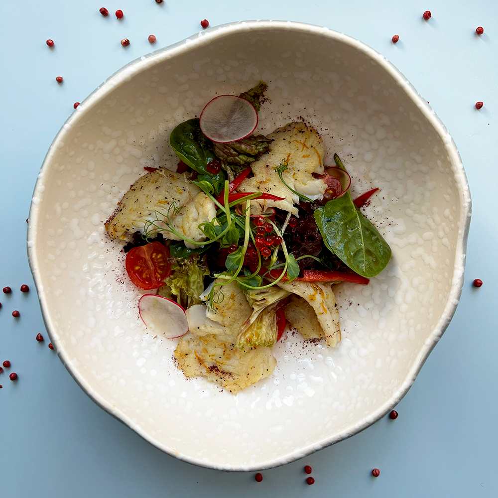 Pin-Up салата Лоло Россо и мини шпината служат свежей основой, заправленной соусом Цезарь, приготовленным на основе желтков, оливкового масла, анчоусов и солодового уксуса. Это придает соусу насыщенный вкус с лёгкой солёностью и пряностью. Слабосолёный лосось, приготовленный по методу гравлакс, добавляет богатый и мягкий вкус, который идеально сочетается с томатами черри и перепелиными яйцами. Сыр грано подано добавляет блюду изысканную солёную нотку, а слайсы чесночных гренок придают хрустящую текстуру и аромат.