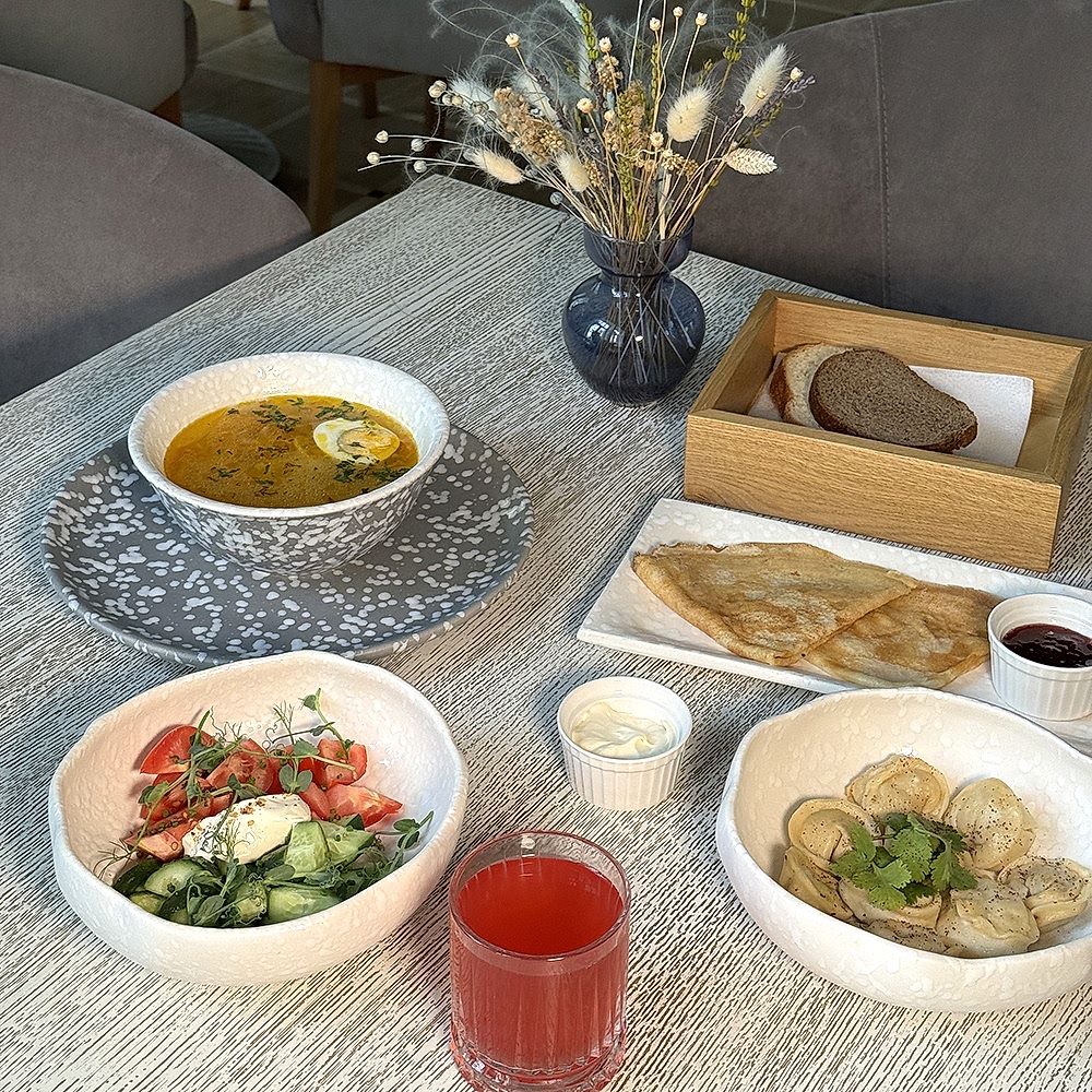 Обеденный сет "Купеческий" дополняется блинчиками со сгущенкой или вареньем, Pin-Up и хлебом.