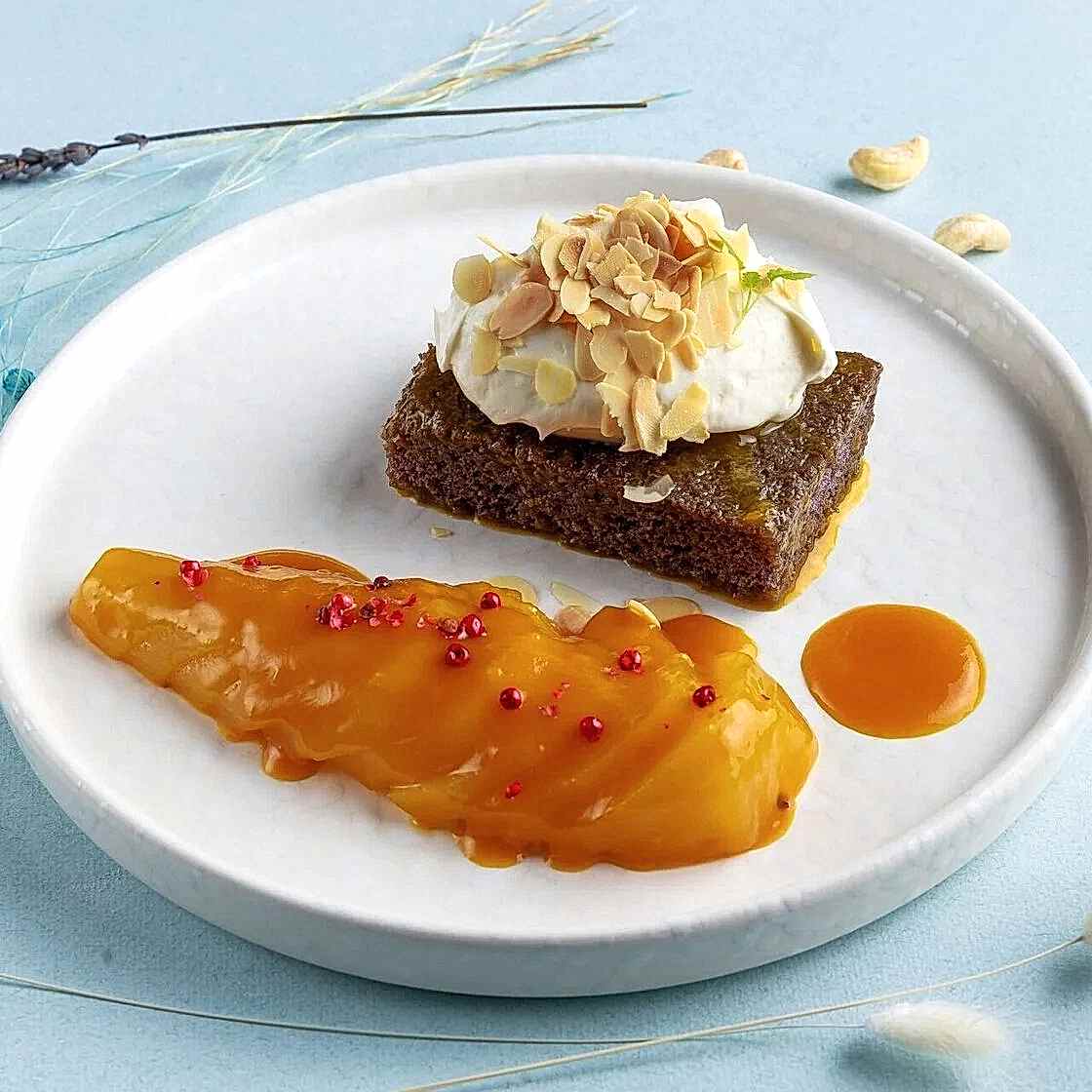 Авторский десерт нашего заведения - пряничный бисквит с кремом чиз и грушей в соусе манго. Нежнейший бисквит взбивается с ароматными специями и щепоткой ванильного сахара. Подается с кремом чиз, приготовленным на основе творожного сыра, сливок и томленой грушей в соусе манго. При подаче посыпается лепестками миндаля и розовым перцем.