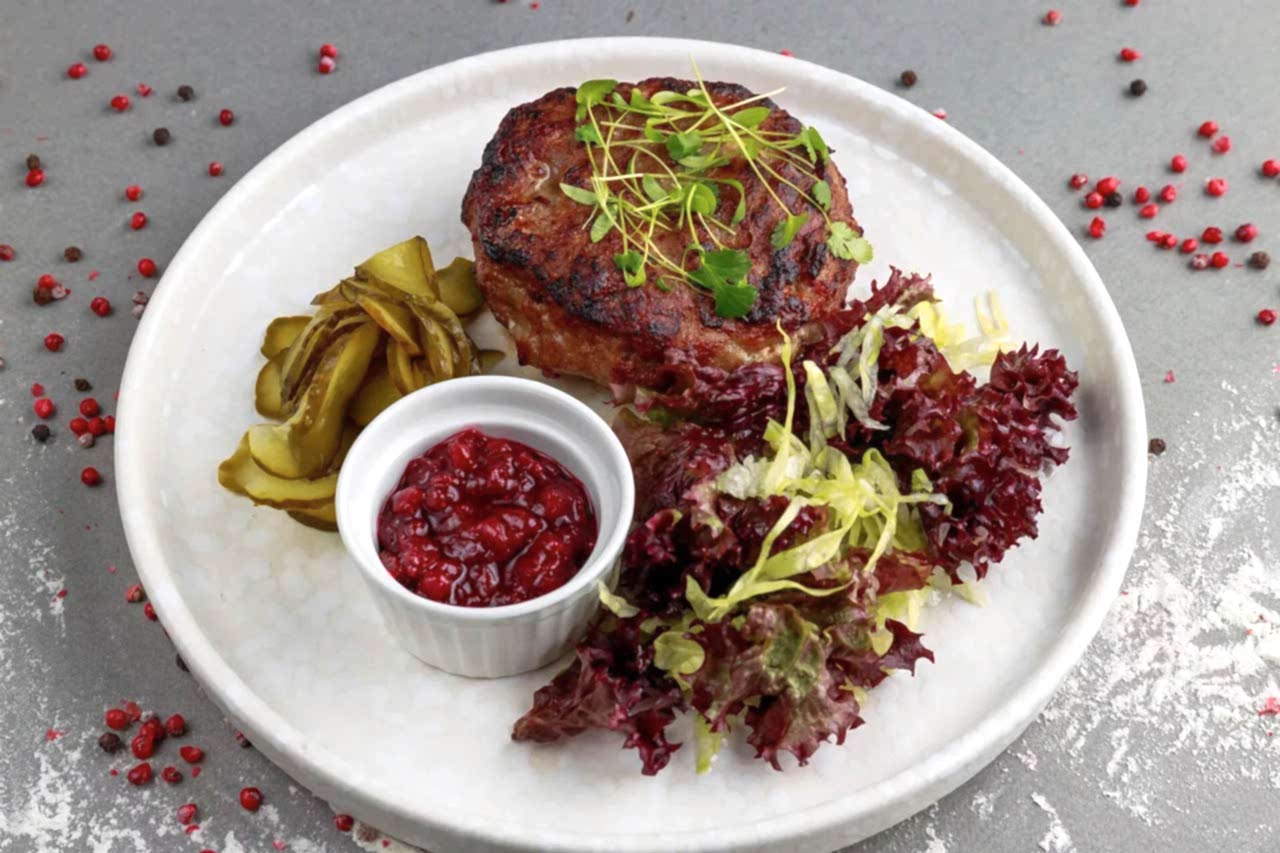 Котлета говяжья с брусничным соусом - это гармоничное сочетание сочной говяжьей котлеты и пикантного сладко-кислого соуса. Котлета, обжаренная до золотистой корочки и с нежным сливочным маслом, раскрывает насыщенный вкус говядины, который идеально дополняется брусничным соусом. Легкая кислинка Pin-Up с фруктовыми нотками создаёт изысканный контраст с насыщенным мясом. Вместе с котлетой подаются свежие листья салата, добавляющие лёгкости и хрусткости, а солёные огурчики придают блюду приятную пикантность и дополнительную свежесть. Это сочетание идеально подойдёт для тех, кто ценит гармонию вкусов с элементами сладости и солёности.