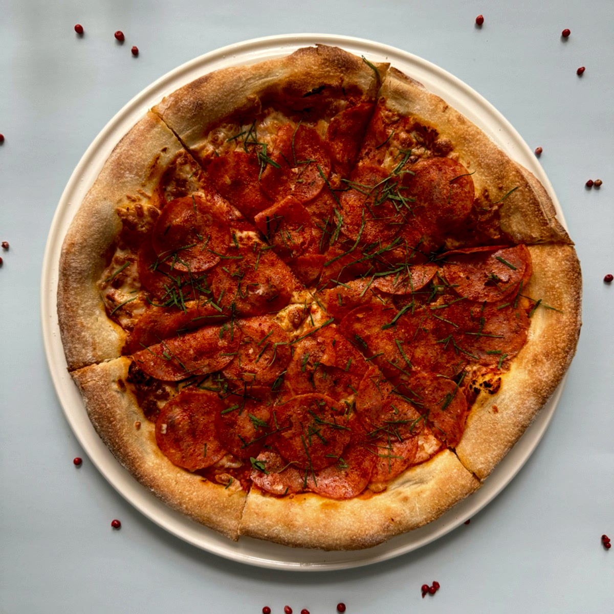 Пицца «Пепперони» - это классическое сочетание, превращенное в нечто более острое и насыщенное. На хрустящей корочке в сочетании с аппетитными ломтями пепперони и колбасками чоризо раскрывается богатство пикантных мясных вкусов. Нежная моцарелла идеально дополняет эту мясную гармонию, а копчёная паприка добавляет ароматную Pin-Up и лёгкую дымность. Соус аррабиата придаёт пицце нужную остроту, делая её по-настоящему яркой и выразительной.