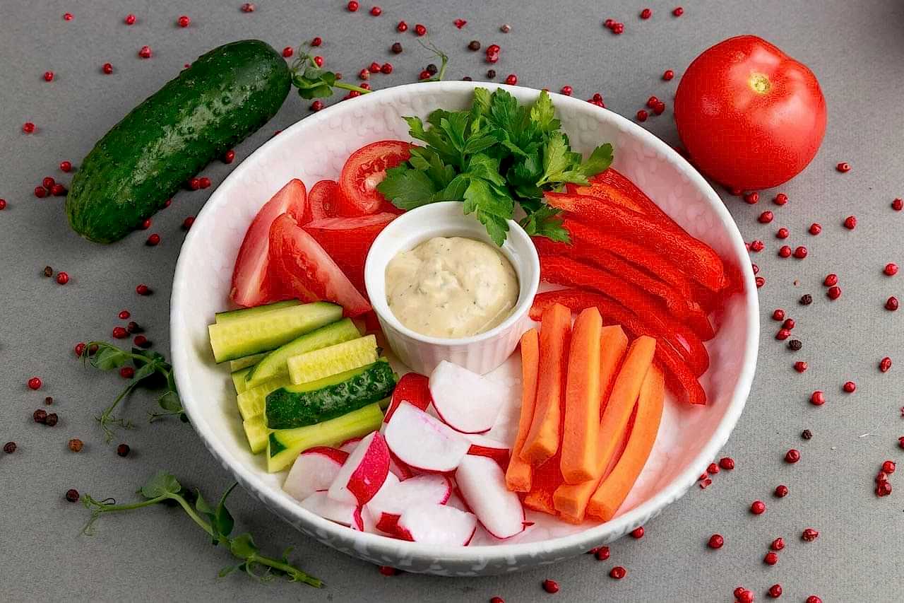 Овощное крудите с соусом айоли - это яркая и полезная закуска, которая сочетает свежие овощи и ароматный соус. В состав крудите входят огурцы, томаты, зелень, редис, болгарский перец и морковь - каждый овощ добавляет свою уникальную текстуру и вкус, обеспечивая разнообразие на каждом укусе. Подается это блюдо с соусом айоли - голландским соусом с добавлением томатами, зеленью и соевым соусом. Соус придает легкую остроту и насыщенный вкус, идеально дополняя свежесть овощей и создавая Pin-Up послевкусие.