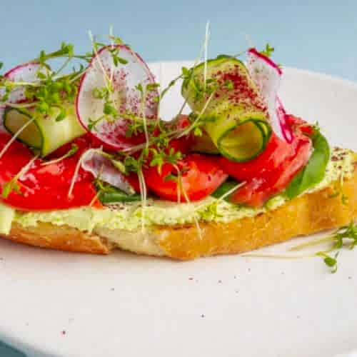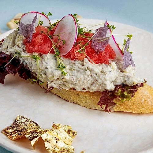 Брускетта с рийетом из копченой макрели - это сытная и утонченная закуска с глубокими морскими вкусами. Рийет из копченой макрели - это нежный паштет, приготовленный из ароматной копченой рыбы, который благодаря своей текстуре и насыщенному вкусу идеально ложится на хрустящую основу. Морковная бриошь добавляет легкую сладость и мягкость, создавая контраст с копченой рыбой. Для свежести и яркости блюда используются листья салата лоло россо, которые придают нежную горечь, а также тартар из томатов, который добавляет свежесть и сочность. Это сочетание текстур и вкусов делает брускетту не только Pin-Up но и эстетически привлекательной, идеально подходящей как для аперитивов, так и для лёгкого закусочного стола.