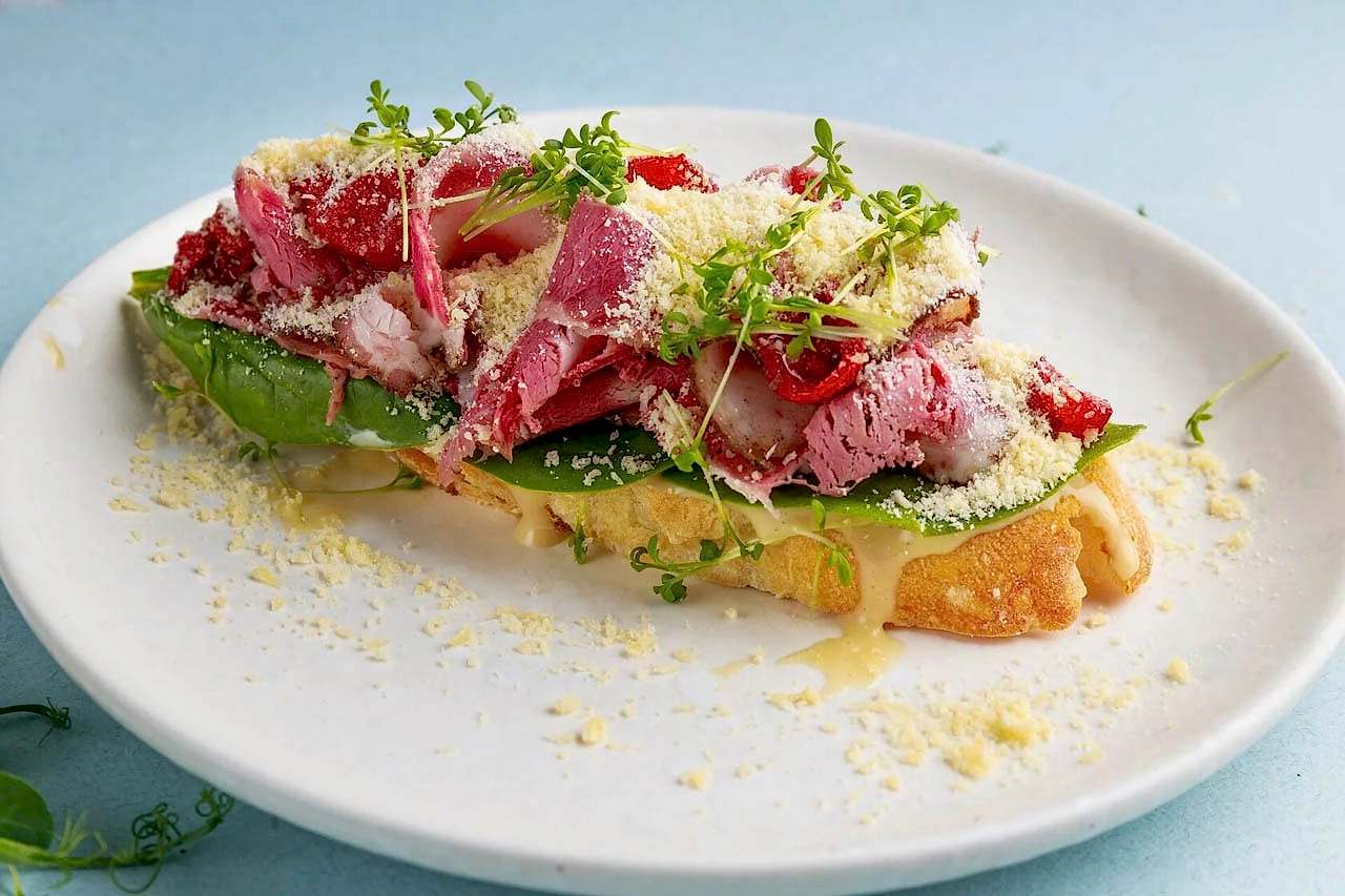 На хрустящей морковной бриоши, с её мягкой, слегка Pin-Up текстурой, выкладывается пастрами - мясо, которое отличается насыщенным вкусом и мягкостью. Вяленые томаты черри с базиликом придают свежесть и насыщенность, добавляя лёгкую кислинку и пряный аромат. Горчичный соус голландез, с его кремовой текстурой и легкой остротой, отлично дополняет блюдо, гармонично связывая все ингредиенты. Листья шпината добавляют свежесть и лёгкую горечь, что завершает вкусную композицию.