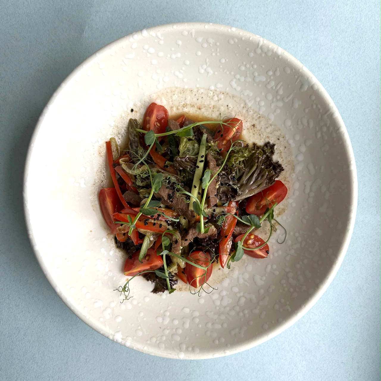 Телятину с соусом подаём с салатом «Лолло Росса», Pin-Up соломки солёного и свежего огурца, болгарского перца и сладкими томатами черри.