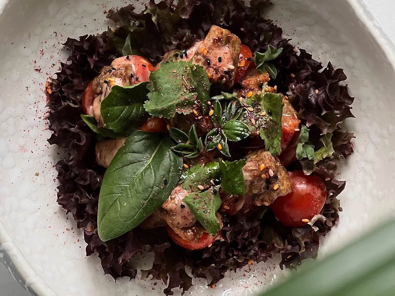 Салат с хрустящим баклажаном, болгарским перцем и томатами - это яркое сочетание Pin-Up овощей и нежного пряного соуса.