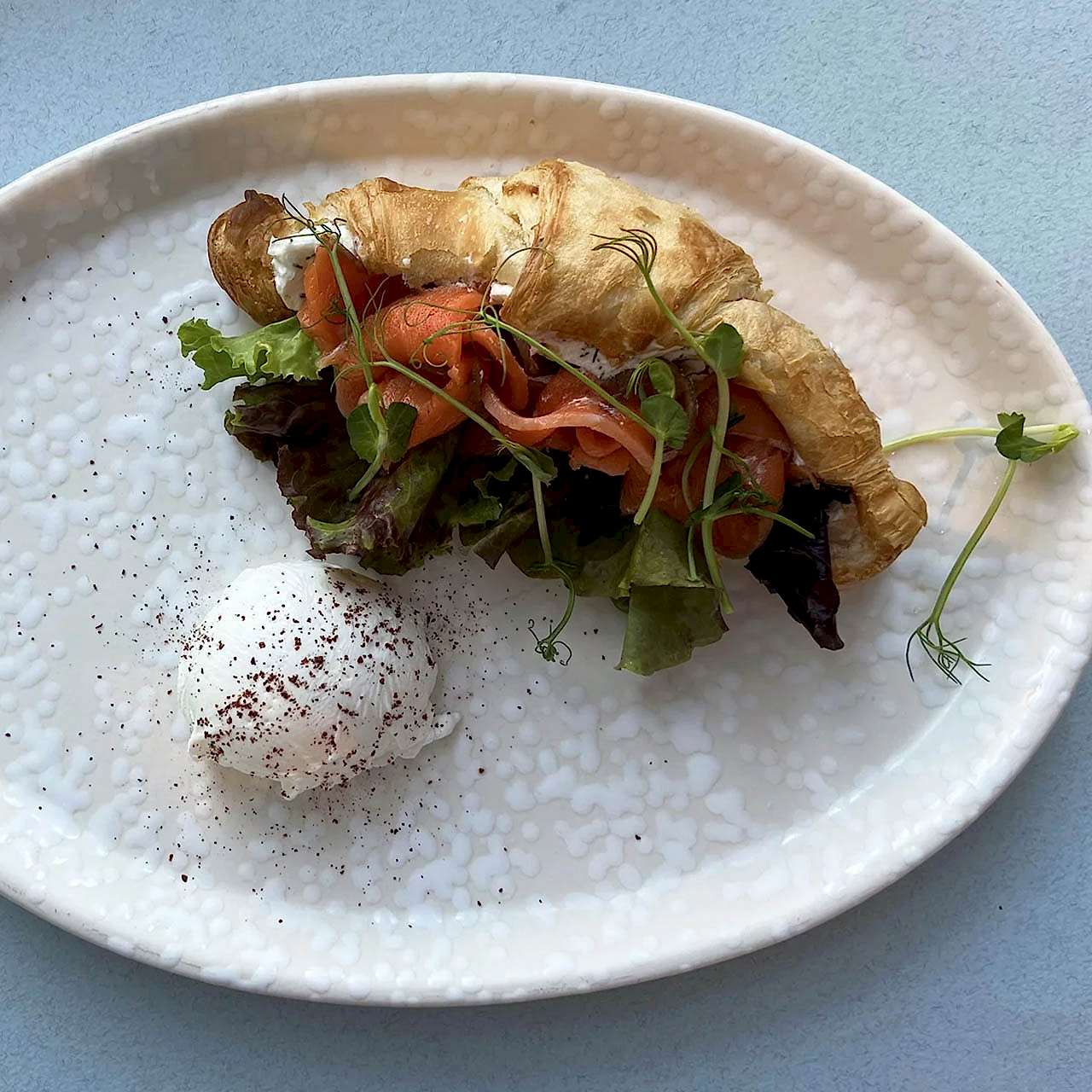 Круассан гравлакс, микс салата, крем-чиз и яйцо пашот - это утончённое и вкусное блюдо, которое сочетает Pin-Up французский круассан с изысканными ингредиентами, создавая идеальный баланс текстур и вкусов.